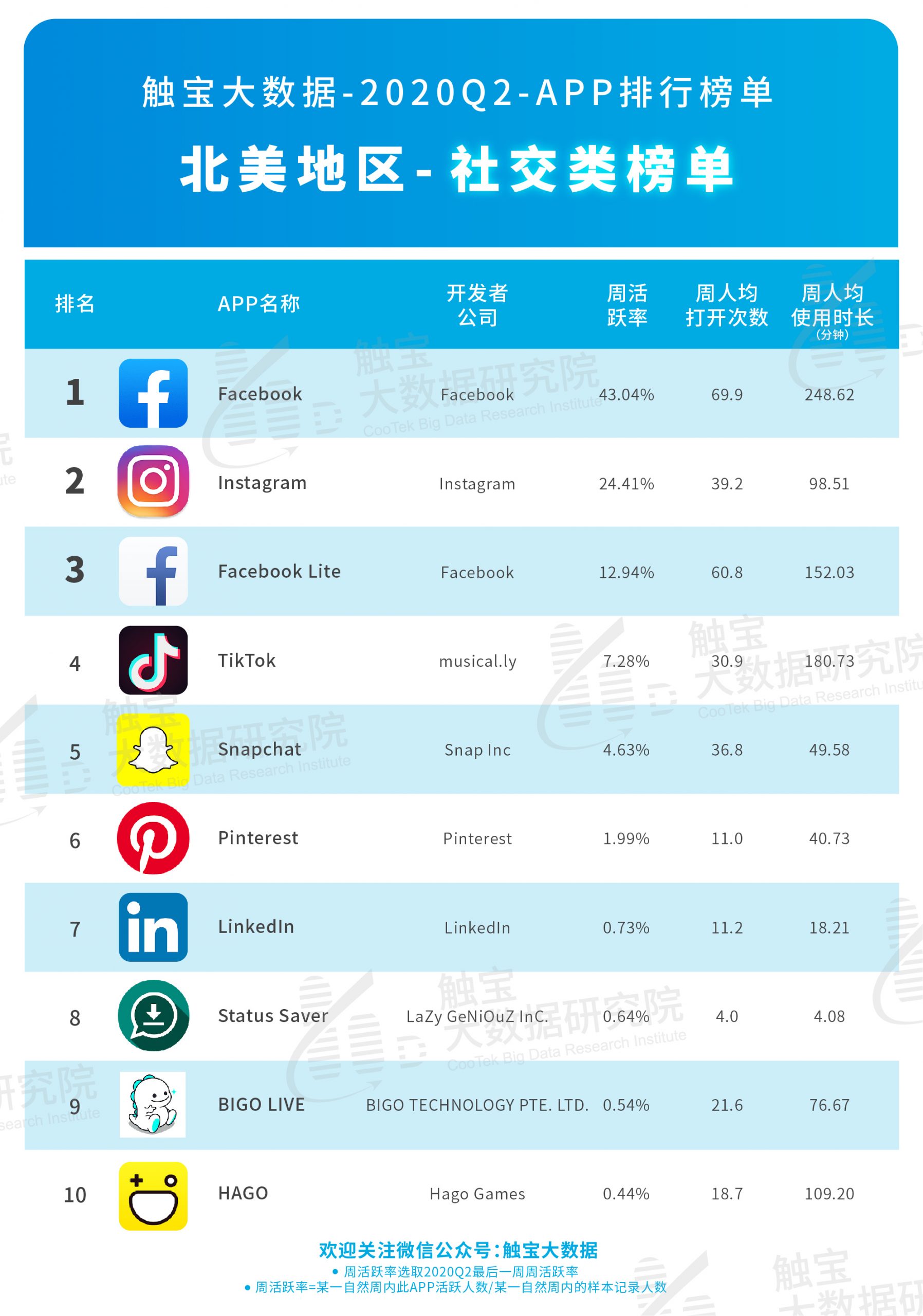 触宝大数据研究院近来发布了2020 Q2北美商场APP排行榜。依据榜单显现,北美区域在Q2初疫情较为平稳,疫情平稳后部分线下活动逐渐提高,出行、旅行、拍摄头部运用流量正在缓慢上升,但由于疫情对用户出行仍有约束,经过手机进行泛文娱互动持续升温。音乐、视频等运用在时长上有所添加,互动需求有多添加。由于疫情持续时刻较长,用户在线上的部分文娱习气预期将会持续较长时刻。但触宝(NYSE:CTK)大数据研究院以为,由于7月初美国及拉美区域疫情压力仍较重,线下流量康复的进程较为弯曲。